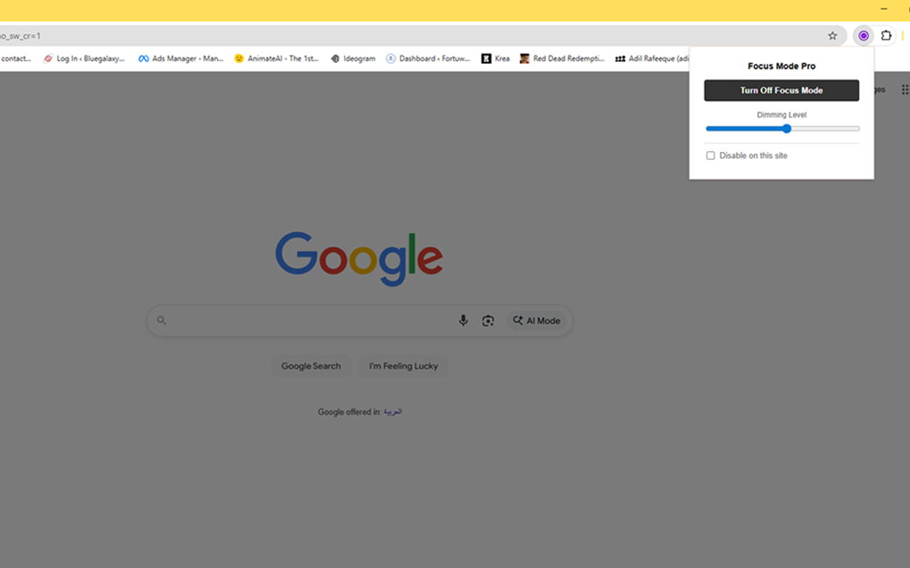 Focus mode professional is a Chrome extension that can Instantly dim any website to reduce eye strain. Features customizable brightness, site whitelisting, and keyboard shortcuts.